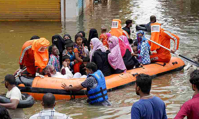 Cư dân được sơ tán khỏi một khu phố ngập lụt ở thành phố Hyderabad, Ấn Độ, hôm 15/10. Ảnh: Reuters.