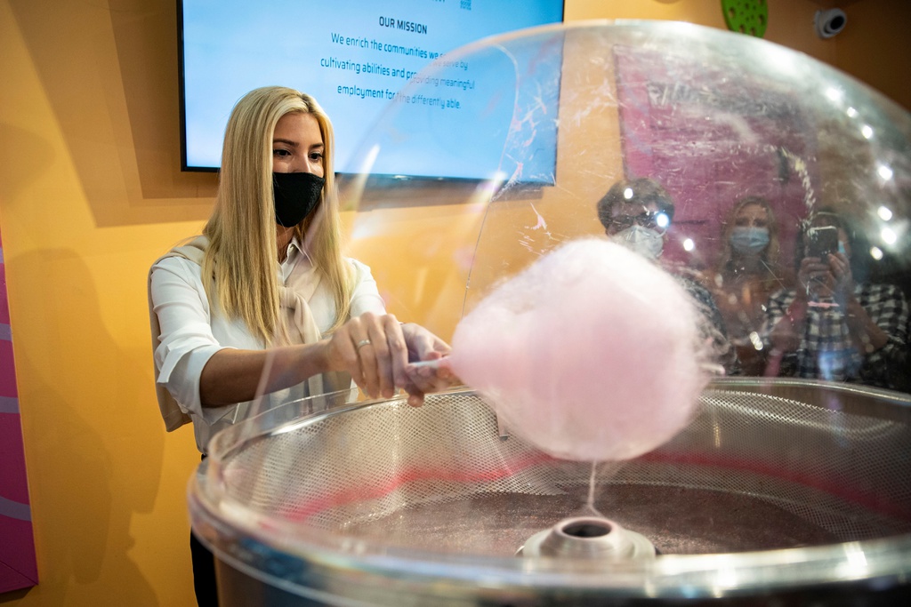 Ivanka Trump thử làm kẹo bông gòn tại chuyến đi tranh cử ở North Carolina. Ảnh: Reuters.