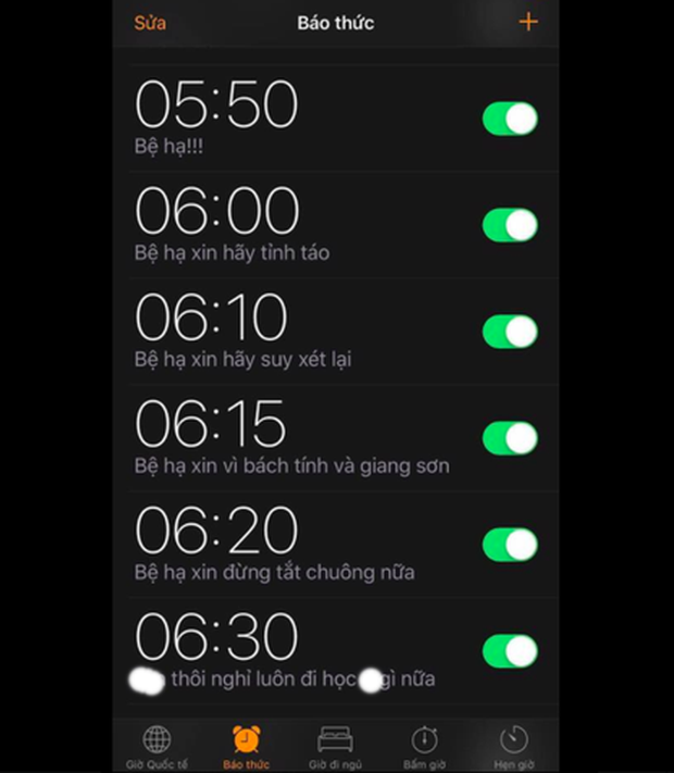 Một trường hợp điển hình của những thanh niên đặt hàng chục báo thức cách nhau vài phút (Ảnh: Facebook)