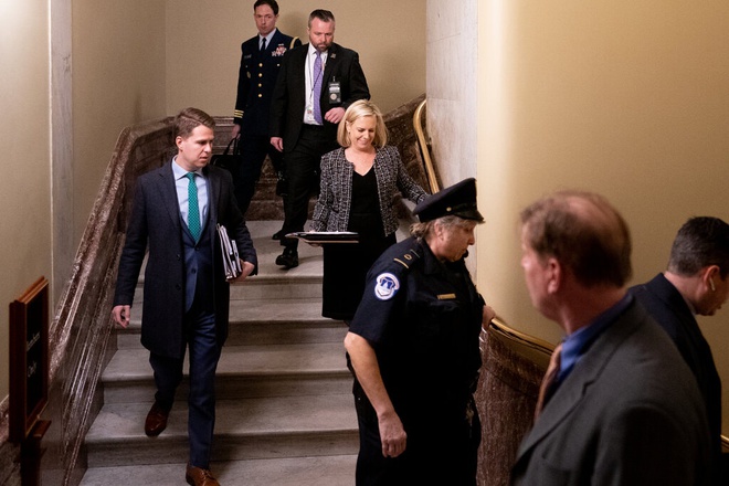 Miles Taylor (trái) từng giữ chức Chánh văn phòng Bộ An ninh Nội địa Mỹ, từ chức vào tháng 6/2019 sau khi Bộ trưởng Kirstjen Nielsen bị sa thải. Ảnh: New York Times.