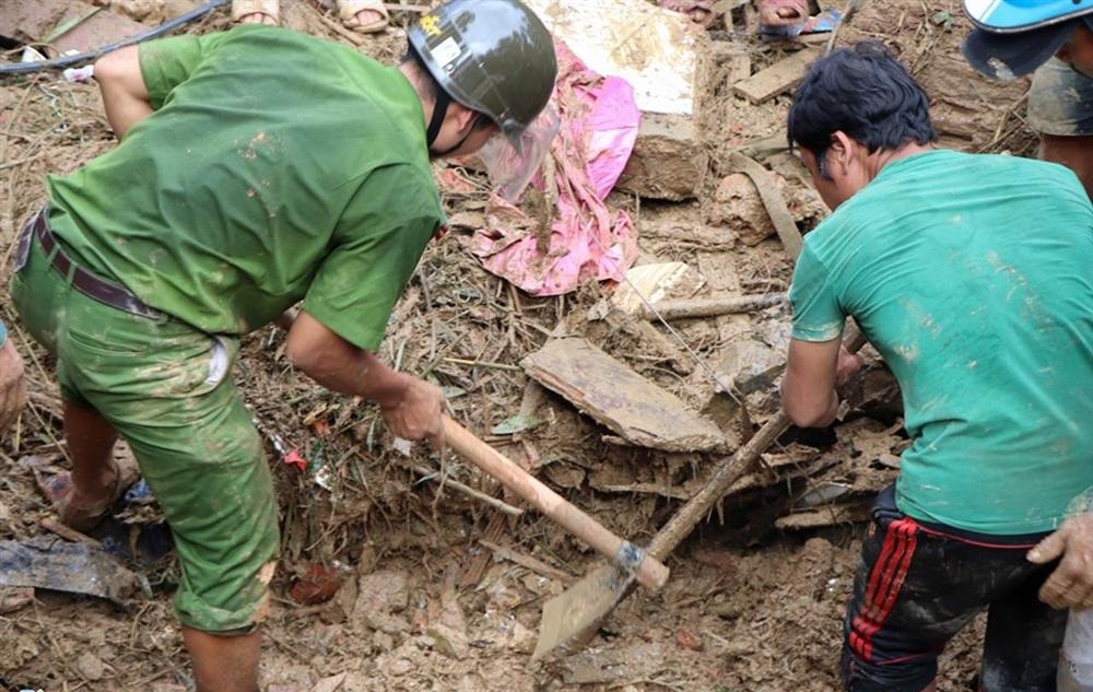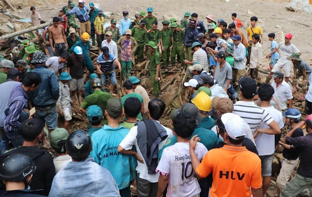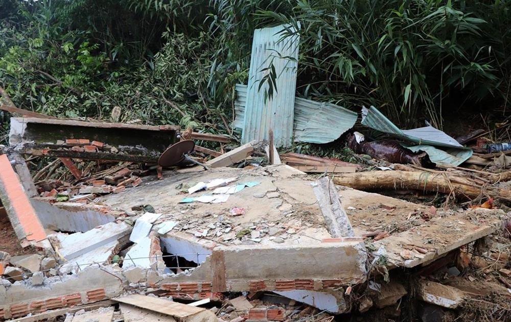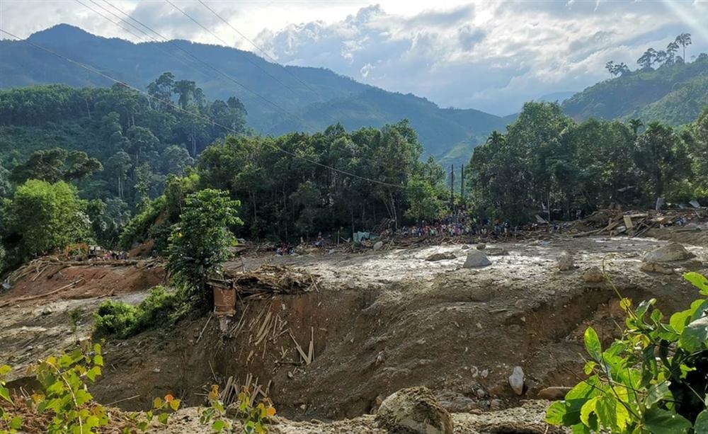 Nước lũ tràn về kèm theo sạt lở đất, 1 xóm với 11 gia đình của xã Trà Leng, huyện Nam Trà My, Quảng Nam, gần như bị san phẳng. 45 người bị vùi lấp dưới đống đất đá.