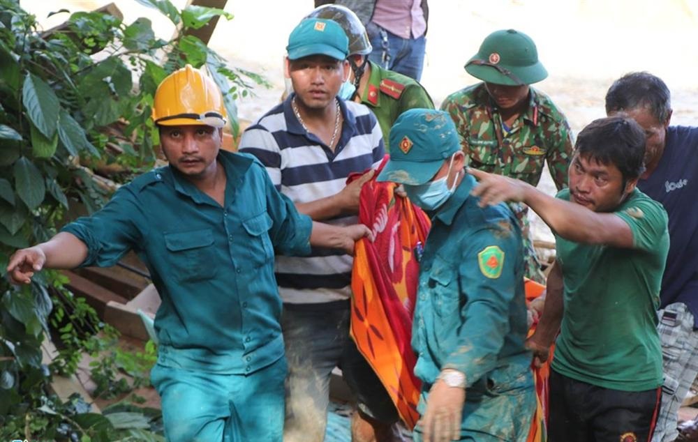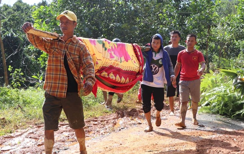 Những nạn nhân bị thương trong vụ vùi lấp được người dân khiêng ra ngoài từ sáng 29/10. Lực lượng cứu trợ sử dụng võng cõng người bị thương hơn 20 km mới tới trạm y tế.