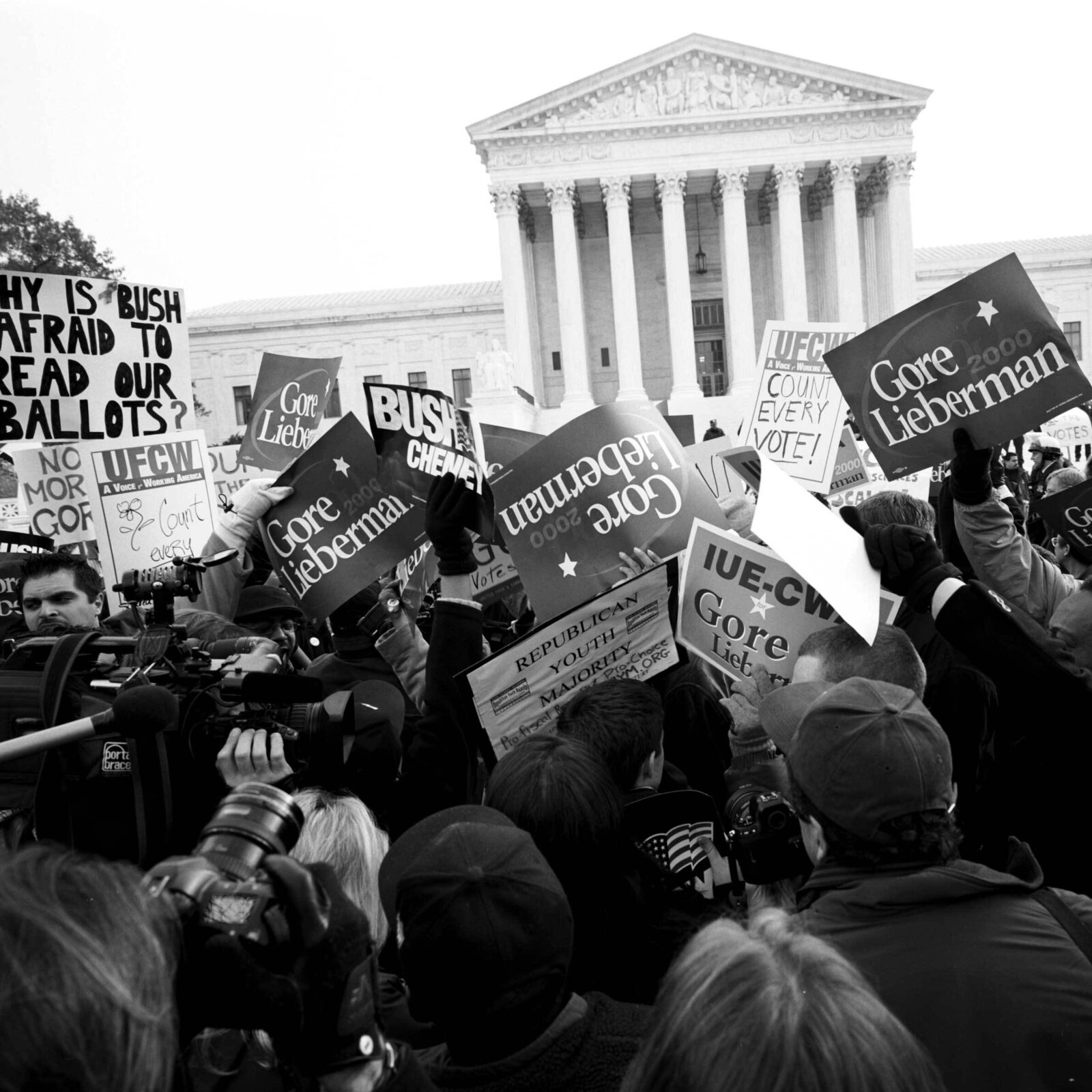 Biểu tình bên ngoài Tòa án Tối cao Mỹ khi cuộc bầu cử năm 2000 dẫn đến tranh cãi về phiếu bầu ở bang Florida.