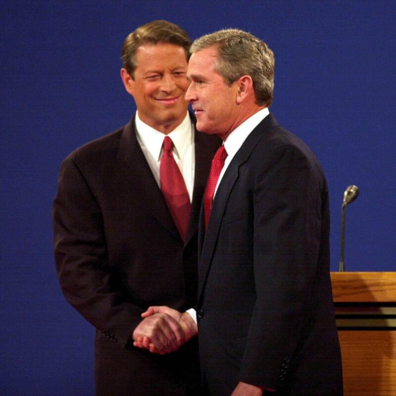 Ứng viên đảng Dân chủ Al Gore bắt tay với ứng viên đảng Cộng hòa Geogre W. Bush trước cuộc tranh luận năm 2000.