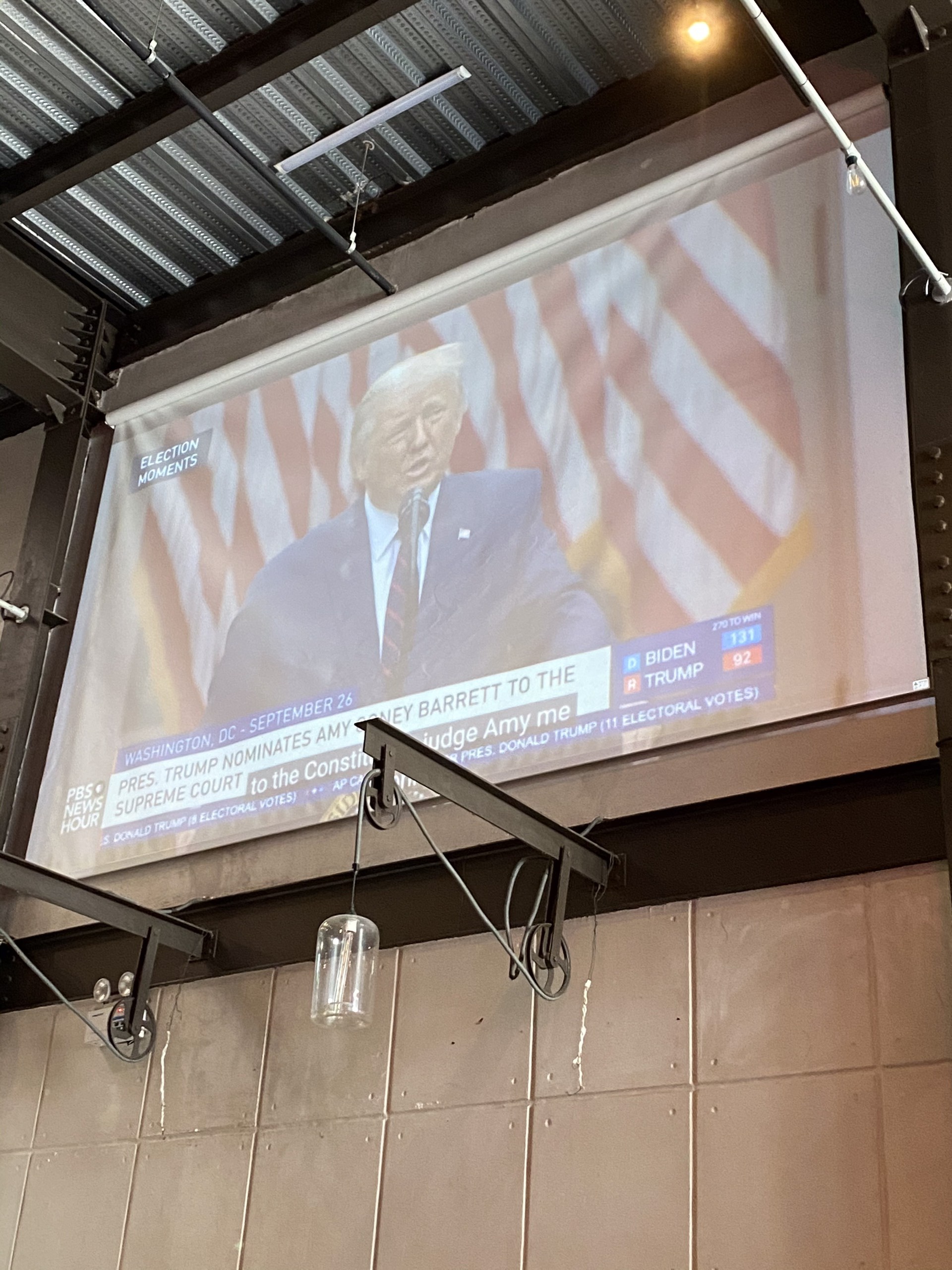Màn hình chiếu chương trình theo dõi kết quả bầu cử Mỹ tại quán bia trên đường Lý Tự Trọng, quận 1, TP.HCM sáng 4/11. Ảnh: Alexander Parini.