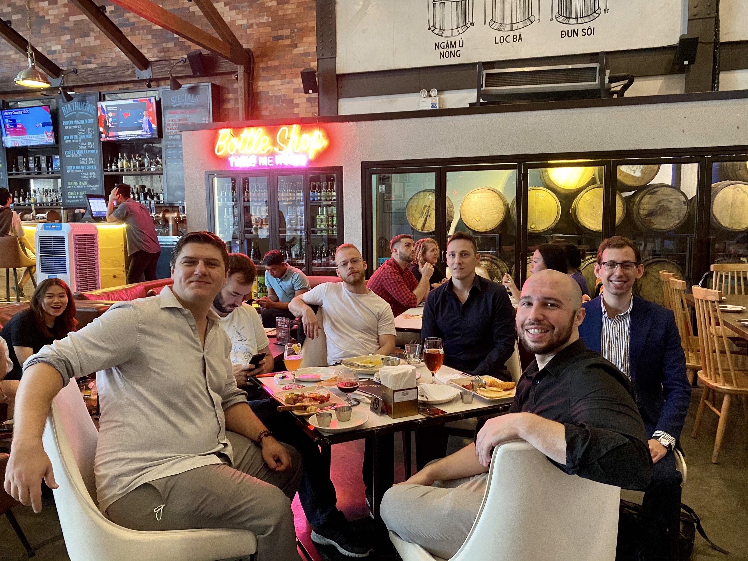 Alexander Parini (áo vest, ngoài cùng bên phải) và bạn bè ở sự kiện theo dõi kết quả bầu cử sáng 4/11 tại quán bia trên đường Lý Tự Trọng, quận 1, TP.HCM. Ảnh: Alexander Parini.