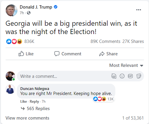 Trong 24h qua, ông Trump đã có động thái bất ngờ khi đăng và chia sẻ tới 29 bài viết/video trên trang Facebook "Donald J. Trump". Tất cả các bài viết đều có nội dung liên quan tới bầu cử. Trong số đó, đáng lưu ý nhất là những nội dung liên quan tới cuộc chiến pháp lí tại các bang với số phiếu đại cử tri lớn, bao gồm Wisconsin, Pennsylvania, Georgia và cả bang Nevada.