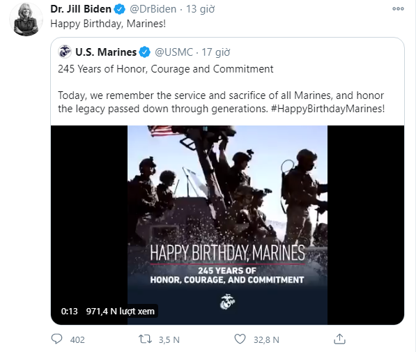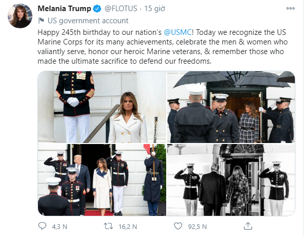 Đệ nhất phu nhân Mỹ cũng gửi lời chúc mừng sinh nhật lần thứ 245 của Thủy quân lục chiến Hoa Kỳ. Bà cho hay: "Chúng tôi ghi nhận những thành tích mà Thủy quân lục chiến đã đạt được và tôn vinh các cựu chiến binh, những người đã hết mình phục vụ cho đất nước. Chúng tôi cũng tưởng nhớ những người đã hy sinh để bảo vệ nền tự do độc lập cho mọi người", Đệ nhất phu nhân viết trên Twitter.
