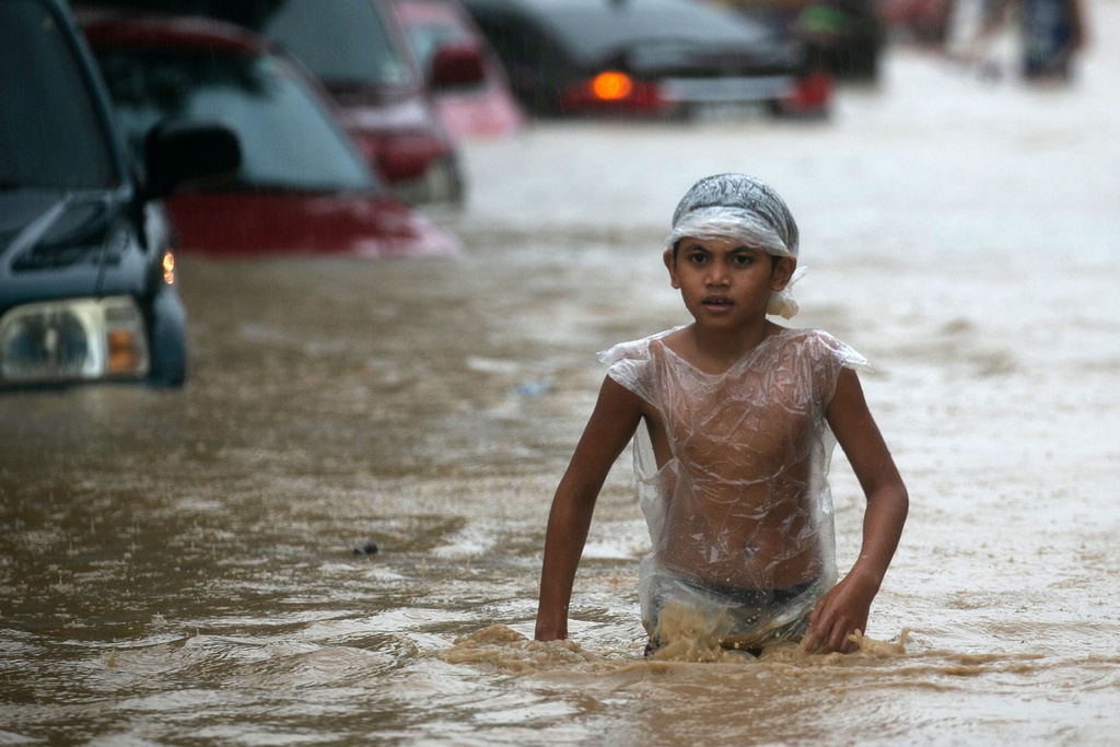 Cậu bé khoác túi nylon che mưa đi trên con đường ngập lụt ở Marikina, vùng thủ đô Manila.