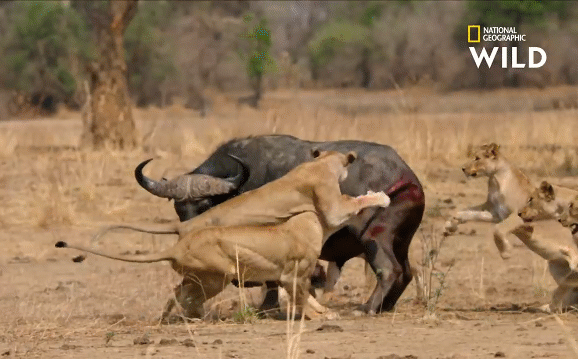 Cả đàn sư tử lần lượt chồm lên lưng, quấn lấy chân hòng quật ngã trâu rừng. Con trâu rừng bị cắn gần đứt đuôi vẫn húc tung cả đàn sư tử.