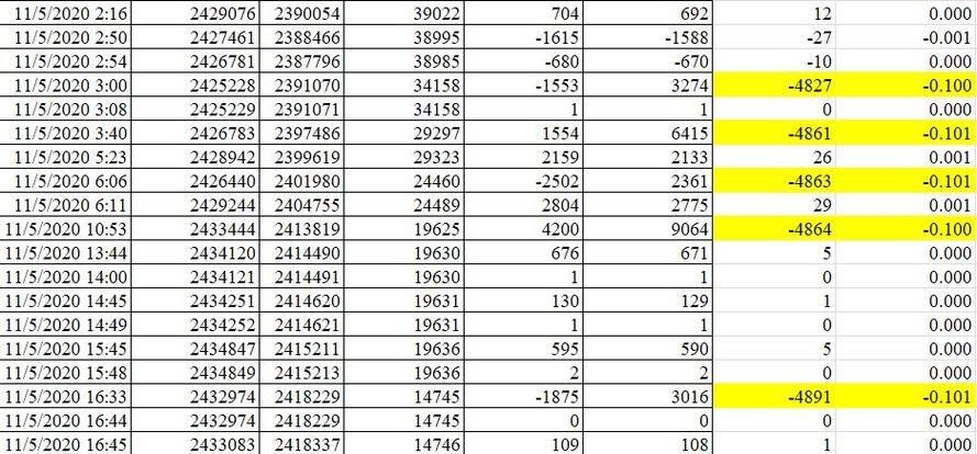 Bạn hãy lướt xuống xem ảnh bên dưới. Các con số được tô vàng là thay đổi ròng. Được tính bằng cách lấy hiệu số phiếu 2 lần cập nhật gần nhất của Trump trừ đi hiệu số phiếu 2 lần cập nhật gần nhất của Biden. Con số này biểu thị cho việc cách biệt của Trump với Biden được nới rộng hay thu hẹp bao nhiêu đơn vị.