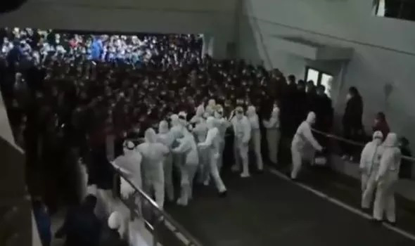 Ảnh cắt từ video được đăng tải trên mạng xã hội cho thấy các nhân viên y tế mặc đồ bảo hộ đang buộc phải cách ly hàng trăm người ngay lập tức tại sân bay Phố Đông ở Thượng Hải.