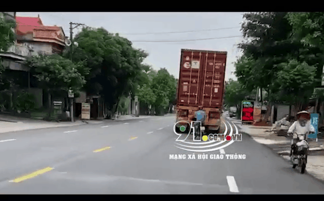 Xe máy lạng lách đòi vượt nhưng bị xe container chèn ép - cảnh tượng khiến nhiều người lo sợ.
