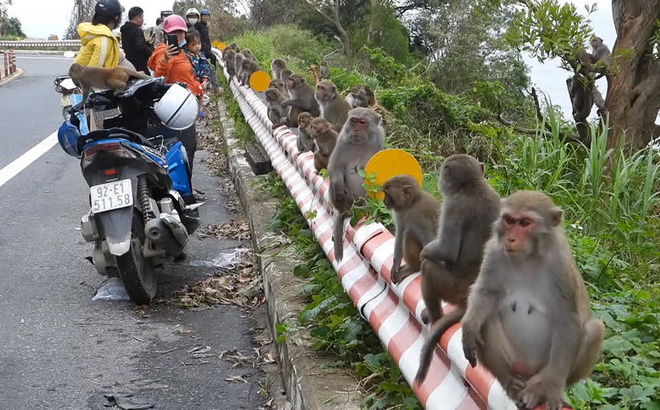 Gần trăm con khỉ ra đường ngồi dọc theo lan can chờ đợi du khách cho ăn. Khi các xe vừa đến, cả đàn chạy lại để giành giật thức ăn, giật cả túi xách, đồ đạc của người ngồi trên xe…Đó là thực trạng của đàn khỉ vàng trên bán đảo Sơn Trà (Đà Nẵng). Thay vì ngồi chờ đợi ở chùa Linh Ứng, hay chỉ một vài con chạy xuống đường như trước, thì nay cả đàn lũ lượt kéo nhau xuống, thản nhiên ngồi chờ đợi du khách đi qua để xin ăn.