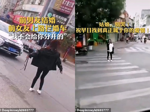Được biết, cô gái và chú rể là người yêu cũ. Sau khi hay tin chàng trai kết hôn, cô nàng quyết định chặn đầu xe cưới, khuyên bạn trai cũ suy nghĩ lại. Mặc dù chiếc xe đã cố rời đi nhưng cô gái vẫn quyết bám chặt không buông. Sau đó, chiếc xe thoát được cô gái và rời khỏi ngã tư.