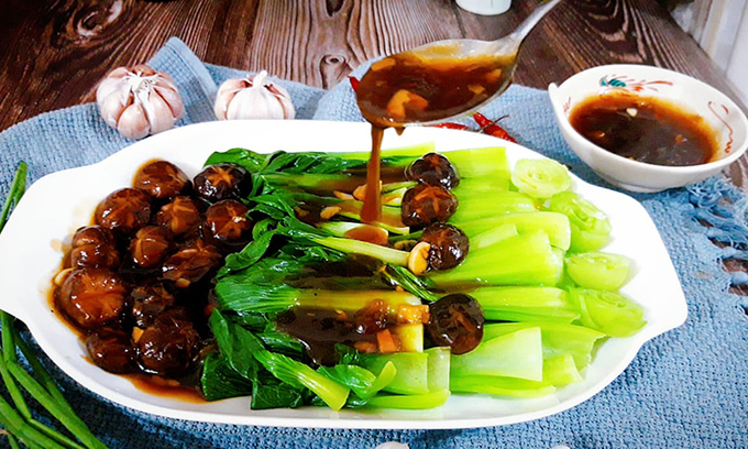 Cải chíp mềm ngọt xanh mướt quyện với nước sốt nấm hương đậm đà khiến cho bữa cơm chiều tan sở muộn trở nên hấp dẫn.