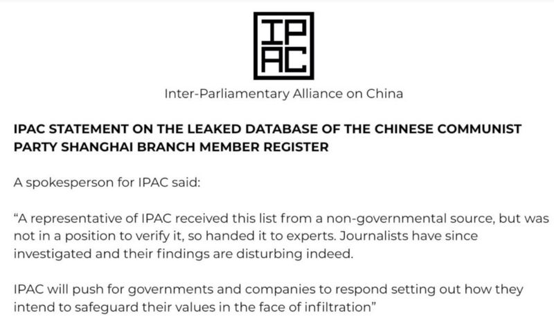 Tháng Chín 2020, họ chuyển cho một nhóm gọi là Inter-Parliamentary Alliance on China, một nhóm tập hợp 150 nghị sĩ các nước có chung lo ngại về Trung Quốc.