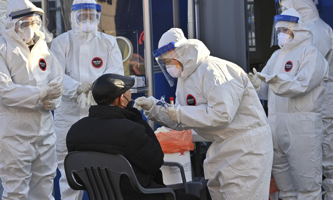 Nhân viên y tế lấy mẫu xét nghiệm cho người dân tại thủ đô Seoul, Hàn Quốc, hôm 14/12. Ảnh: AFP.