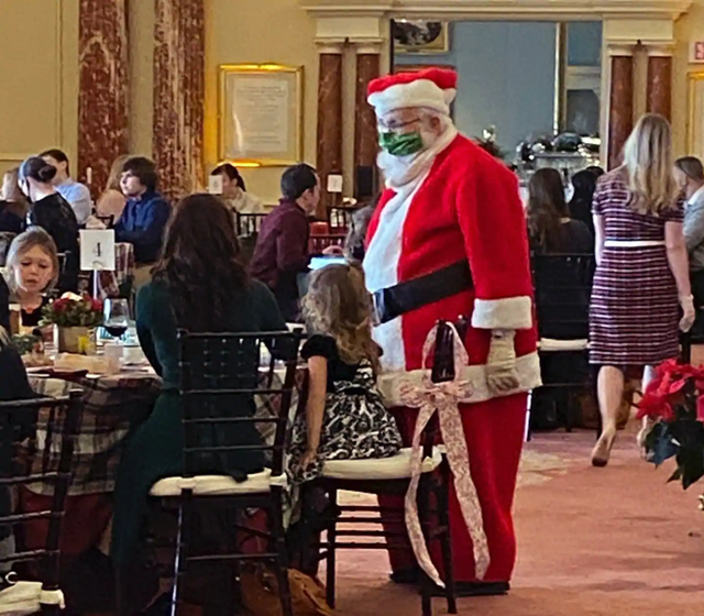 Người đóng ông già Noel đeo khẩu trang tại bữa tiệc do Ngoại trưởng Pompeo tổ chức. (Ảnh: Washington Post)