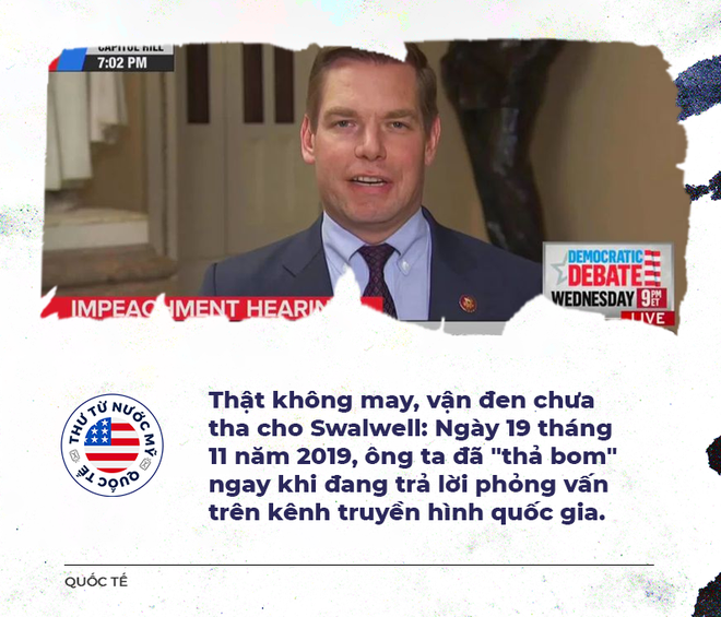 Thật không may, vận đen chưa tha cho Swalwell: Ngày 19 tháng 11 năm 2019, ông ta đã "thả bom" ngay khi đang trả lời phỏng vấn trên kênh truyền hình quốc gia – và thật trớ trêu là tai nạn hy hữu này xảy ra ngay khi ông ta đang lớn tiếng cáo buộc ông Trump là gián điệp của Nga. Nhưng tiếng "bom" tai hại kia còn to hơn giọng của ông ấy.
