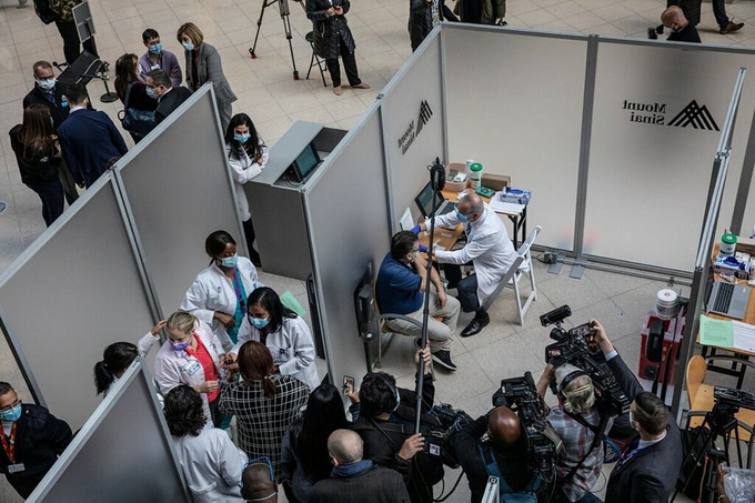 Tại Bệnh viện Mount Sinai ở Manhattan, công tác tiêm chủng diễn ra đơn giản trong phòng khám, nơi các nhân viên y tế có thể rẽ ngang giữa ca trực để nhận vaccine, hoặc lấy cà phê và đồ ăn nhẹ. Các bác sĩ chỉ nhìn lướt người đang đứng xếp hàng xem họ có đủ tiêu chuẩn theo khuyến nghị ưu tiên của chính phủ không.