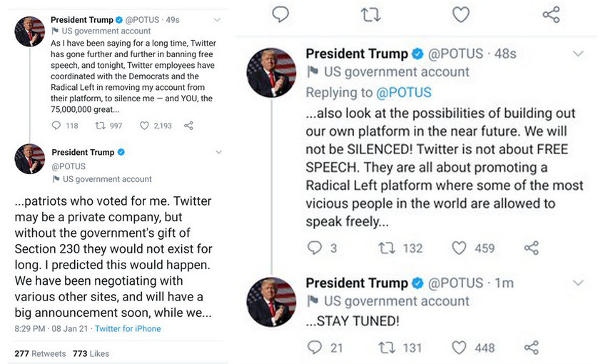 Sau khi bị Twitter khoá vĩnh viễn tài khoản cá nhân, ông Donald Trump đã dùng tài khoản chính thức của Tổng thống Mỹ để thể hiện lập trường, khẳng định "chúng ta sẽ không IM LẶNG!", Tổng thống Trump kêu gọi người ủng hộ trên tài khoản @potus, nhưng không lâu sau đó Twitter đã tiếp tục gỡ bỏ nội dung này.