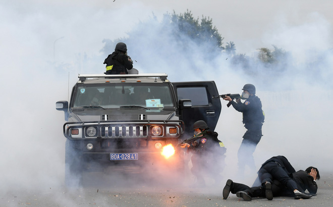 Xe bọc thép Hummer H2 đặc chủng cùng các lực lượng luyện tập tình huống chống bạo động. Ảnh: VGP.