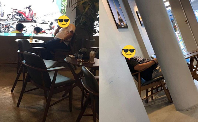 Mỗi khi quán đông, khách khác đến không có chổ ngồi, còn anh ấy thì cứ ngồi uống nước mình mang theo không à, còn ngủ nữa, không ngủ thì xem điện thoại cười rất lớn....