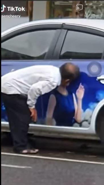 Những hình ảnh ghi lại cảnh người đàn ông có tuổi khá cao, nhưng lại hành động vô cùng nhạy cảm khi mãi hôn vào hình poster của Mỹ Tâm dán trên ô tô để quảng cáo khiến ai nấy phải khó chịu.