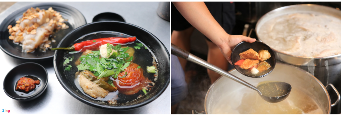 "Mỗi lần tới đây mình ăn 2 phần. Phần nước với mỳ, phần khô chiên giòn, gồm khổ qua, cà tím, ớt đỏ, đậu đũa dồn chả cá. Miếng nào miếng đó ú nu, cắn ăn mà ghiền. Nước dùng thanh ngọt, đậu hũ chả cá ăn kèm mì sợi dai dai. Tối thứ 6 đi vòng vòng thành phố, kiểu gì cũng phải ghé chợ Phùng Hưng, vô Khổ Qua Cà Chớn ăn 2 tô. Ăn xong gọi thêm phần bánh khoai môn tráng miệng", anh Cao Thi nói.