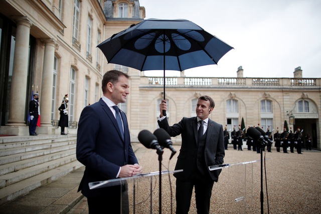 Khi Thủ tướng Slovakia Igor Matovic trao đổi với các phóng viên trước cuộc gặp với Tổng thống Pháp Emmanuel Macron tại Điện Elysee hôm 3/2, một nữ phụ tá đã xuất hiện và đưa cho nhà lãnh đạo Pháp một chiếc ô màu đen. Ông Macron nhận lấy chiếc ô này và che cho nhà lãnh đạo Slovakia.
