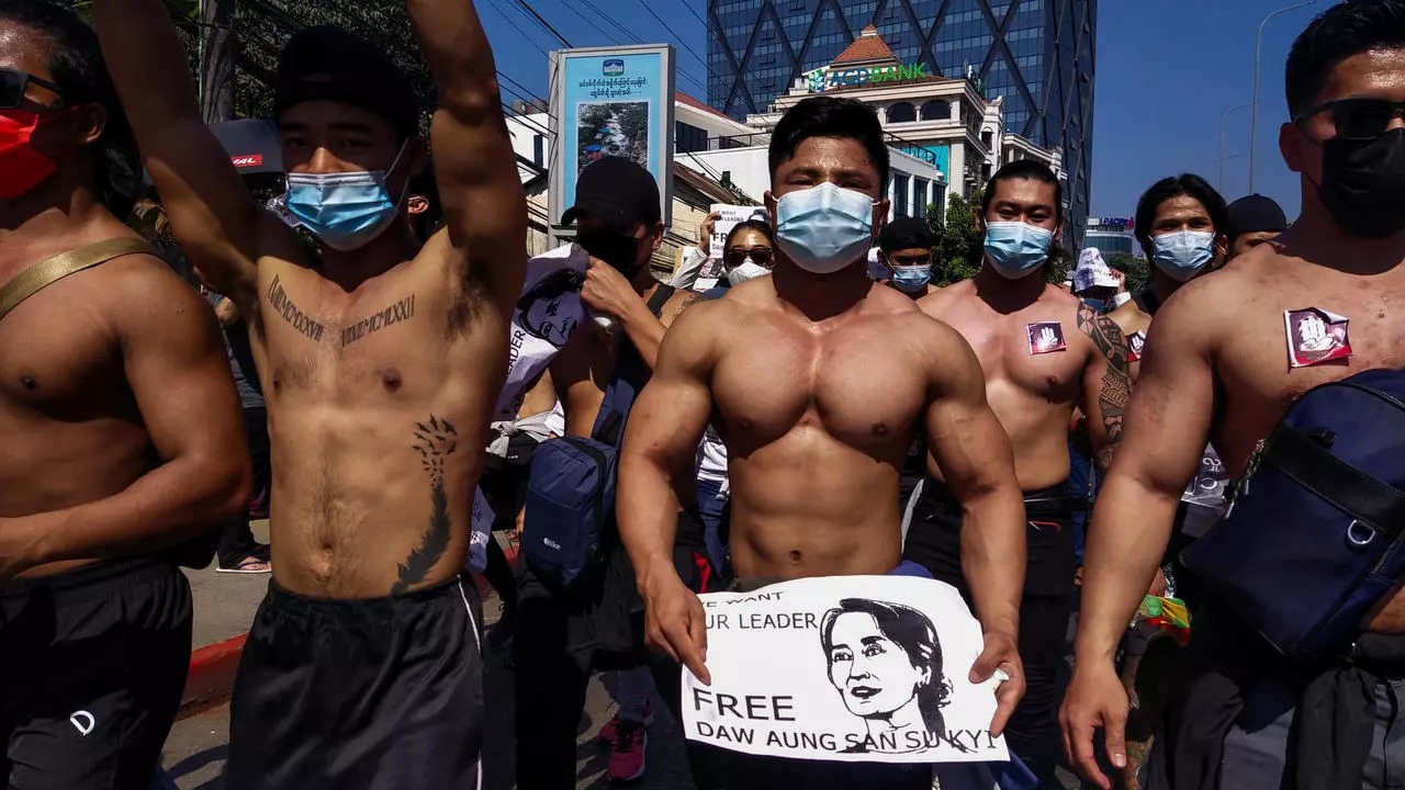 Huấn luyện viên gym tại Yangon Phyo Ko Ko ngày 10/2 cho biết anh muốn "thêm cơ bắp" cho các cuộc biểu tình ủng hộ dân chủ. "Tôi không muốn chính quyền quân sự một chút nào", anh viết khi đăng lên Facebook những bức ảnh anh và các người bạn khoe cơ bụng 6 múi và cơ ngực săn chắc, trong khi cầm tranh có dòng chữ "hãy thả Aung San Suu Kyi".