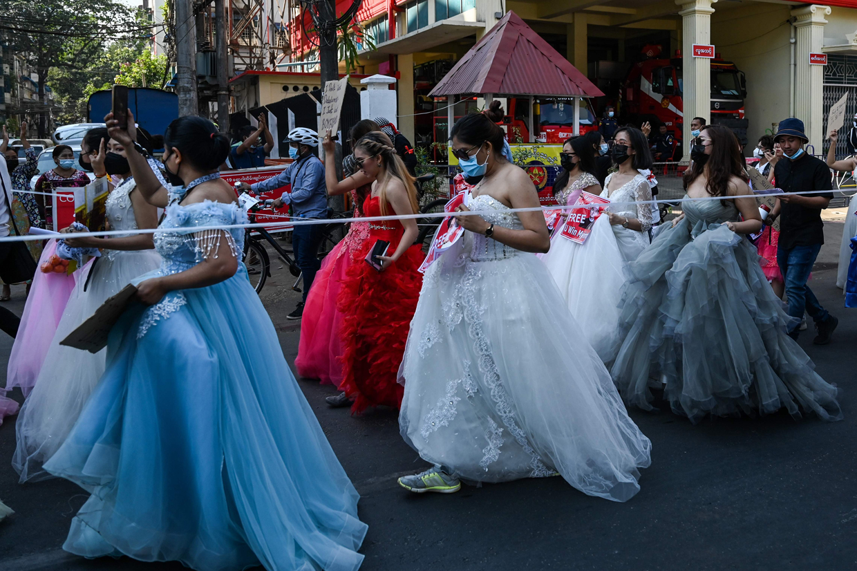 Người biểu tình mặc váy cưới và váy dạ hội tại Yangon ngày 10/2. Ảnh: AFP.