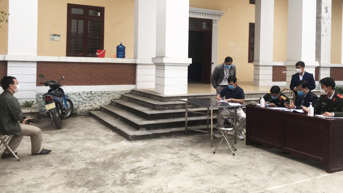 Cơ quan chức năng lập biên bản vi phạm đối với ông Trần Hải Đăng (ngoài cùng bên trái) tại khu cách ly của huyện Yên Dũng. Ảnh: Lâm Dũng