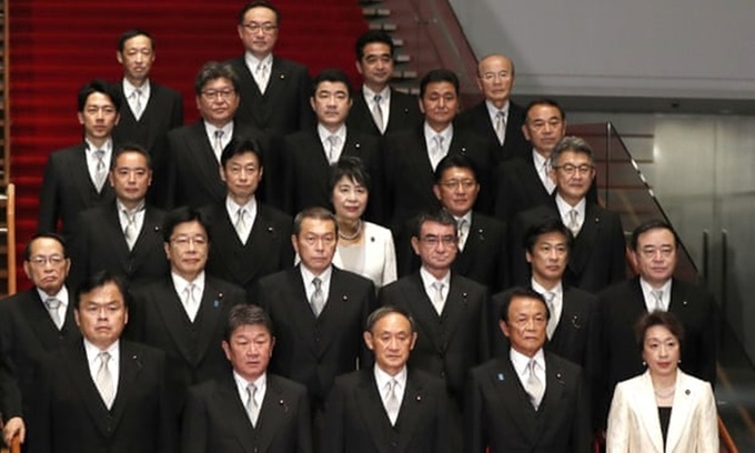 Các thành viên nội các của Thủ tướng Nhật Yoshihide Suga, chỉ gồm hai phụ nữ, khi ra mắt tháng 9/2020. Ảnh: AP.