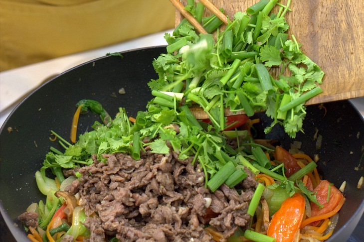 Cuối cùng bạn đổ phần thịt bò vào chảo rau củ xào, đảo một vài lần cho đều rồi tắt bếp. Đổ phần thịt bò xào rau củ lên phở chiên giòn, trang trí món ăn và thưởng thức.