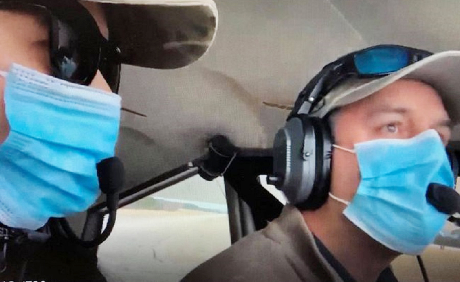 Cô giáo Nguyễn Anh Thư (trái) dạy lái máy bay cho một học viên trong đại dịch COVID-19. Thầy và trò đều phải mang khẩu trang. (Hình: Nguyễn Anh Thư cung cấp)