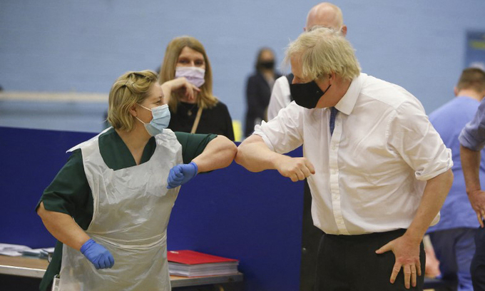 Thủ tướng Anh Boris Johnson (phải) đến thăm một trung tâm tiêm chủng ở Cwmbran, miền nam xứ Wales hôm 17/2. Ảnh: AFP.