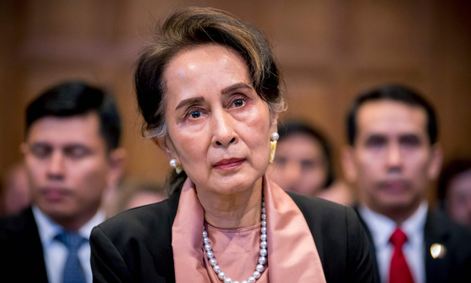 Cố vấn Nhà nước Myanmar Aung San Suu Kyi tại phiên điều trần ở Tòa Hình sự Quốc tế năm 2019. Ảnh: AFP.