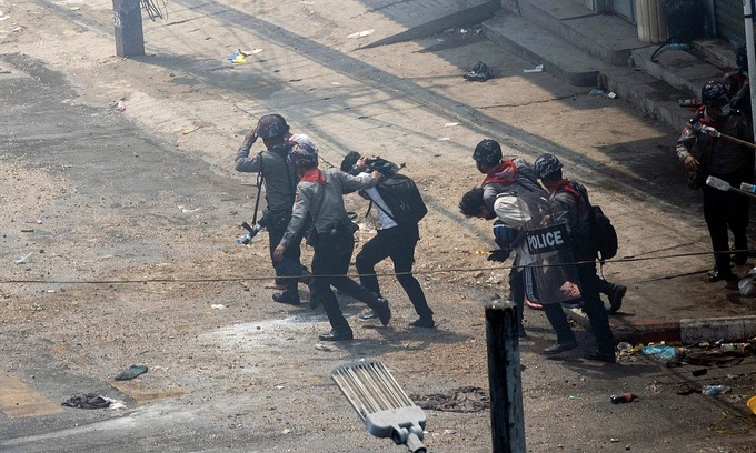 Cảnh sát chống bạo động Myanmar bắt người biểu tình tại Yangon ngày 2/3. Ảnh: Reuters.