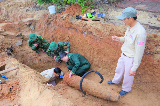 Trước đó, khoảng 11 giờ 30 ngày 2-3, trong lúc thi công dự án nâng cấp tuyến đường Trần Hưng Đạo - Trần Phú tại thị trấn Hoàn Lão, nhóm công nhân của Công ty TNHH tư vấn xây dựng Duy Thịnh tá hỏa khi phát hiện có một quả bom lớn ở độ sâu gần 2m.