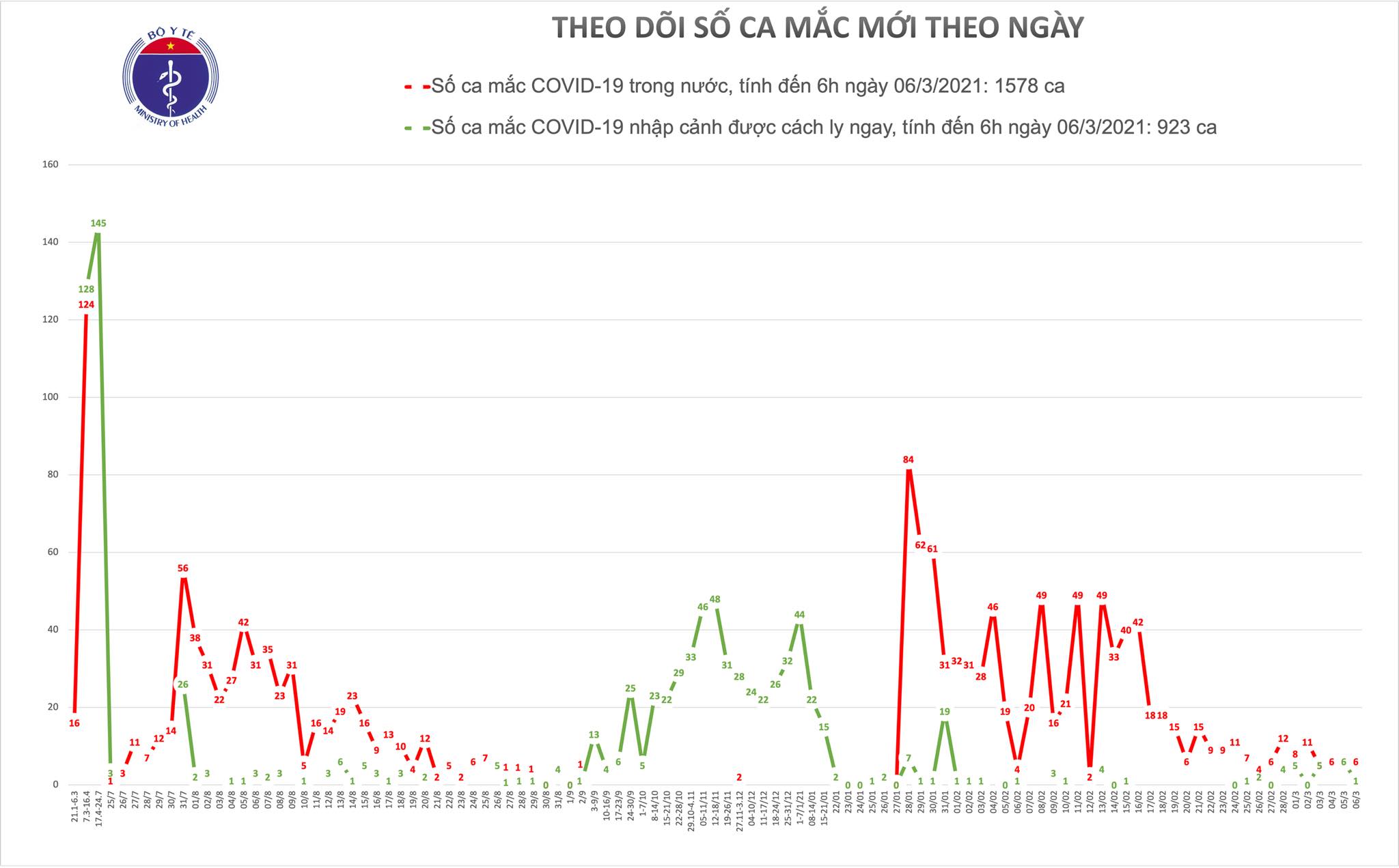 - Tính từ 18h ngày 05/3 đến 6h ngày 06/3: 07 ca mắc mới, trong đó có 01 ca nhập cảnh được cách ly ngay.