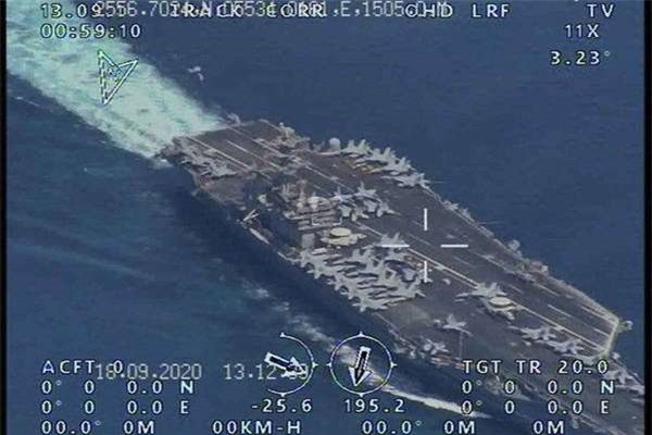 Siêu tàu sân bay USS Nimitz tiến vào Eo biển Hormuz hôm 23/9/2020. Ảnh chụp từ thiết bị bay không người lái của lực lượng Vệ binh Cách mạng Hồi giáo Iran.