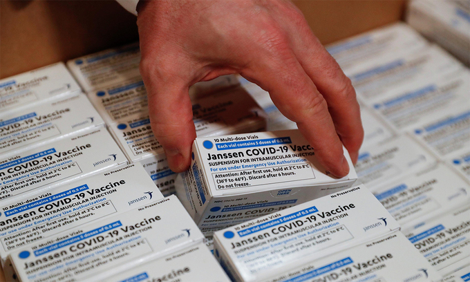 Một nhân viên y tế lấy vaccine Covid-19 của hãng Jassen thuộc tập đoàn Johnson&Johnson khỏi thùng chứa ở Bệnh viện Đại học South Shore, New York, Mỹ, ngày 3/3. Ảnh: Reuters.