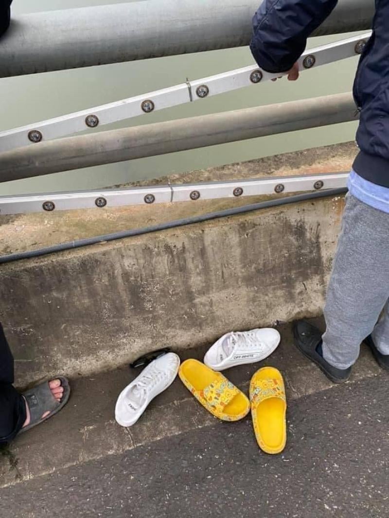 Người dân đi qua đây phát hiện một đôi giày và một đôi dép để lại trên cầu, nghi có người nhảy cầu tự tử nên càng tập trung đông để theo dõi.