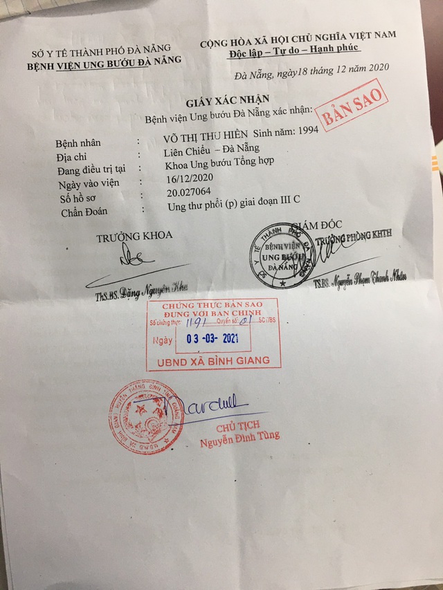 Theo bà Tám, thời gian trước Hiền ho liên tục nhiều tháng không khỏi nhưng do chủ quan nên không thăm khám. Hơn 6 tháng trước, đang làm việc thì Hiền mệt mỏi, ngất xỉu và được đưa đi viện, tại đây các bác sĩ kết luận em bị ung thư phổi giai đoạn 3.