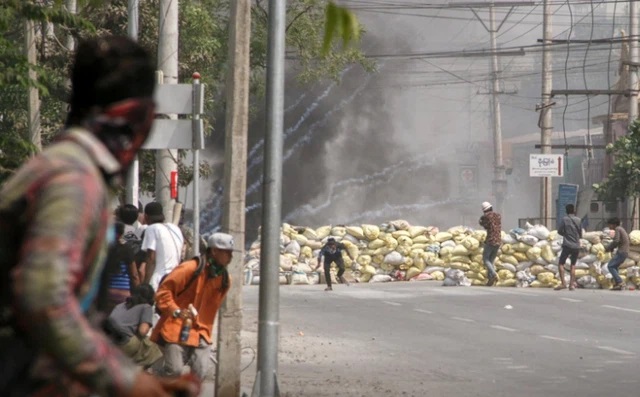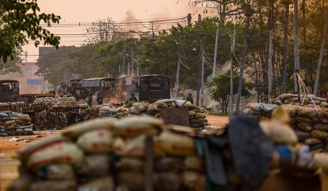 Các binh sĩ gần hàng rào do người biểu tình dựng lên trong cuộc đụng độ ở quận Hlaingthaya của Yangon, Myanmar. Ảnh: AFP