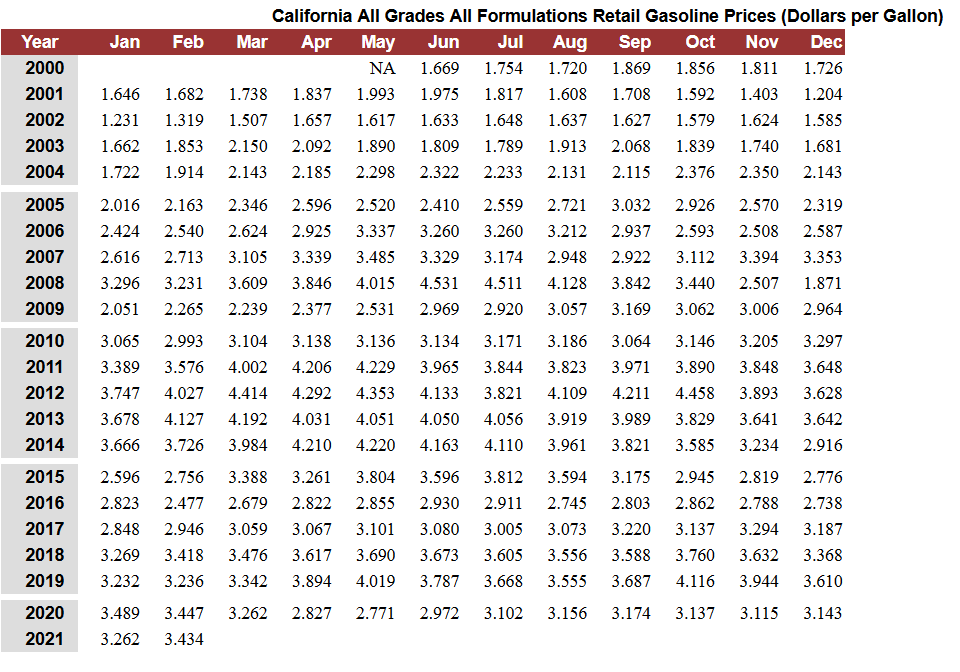 Xăng toàn thế giới đều lên giá chứ không riêng gì Mỹ hay - cái hốc Cali. Việc lên giá xuống giá xảy ra nhiều lần trên đất mỹ - ngay cả thời trump đang bình thường cũng vọt giá lên cao vào năm 10/2019 là $4.116. Giá xăng cũng tùy thuộc từng tiểu bang khác nhau mà có khi bang này cao gấp đôi bang kia.