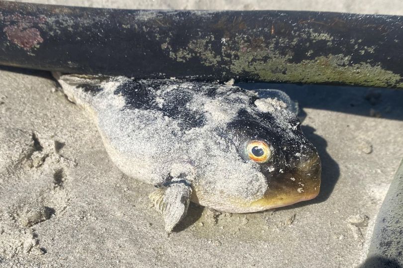 Xác cá nóc "mắt quỷ" trôi dạt vào bờ biển ở Nam Phi. Ảnh: Tess Gridley