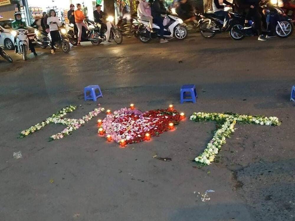 Để thể hiện lòng thành, anh chàng còn mua rất nhiều hoa, bỏ công sức đứng giữa đường xếp chúng thành tên viết tắt của cả hai kèm theo một trái tim lớn chính giữa. Thanh niên này còn xếp nến xung quanh, chỉ cần đợi bạn gái xuất hiện là “lên đèn” để có ngay một không gian lung linh. Màn tỏ tình tốn kém ngay giữa đường của anh chàng thu hút nhiều dân tình đến “hóng hớt”.